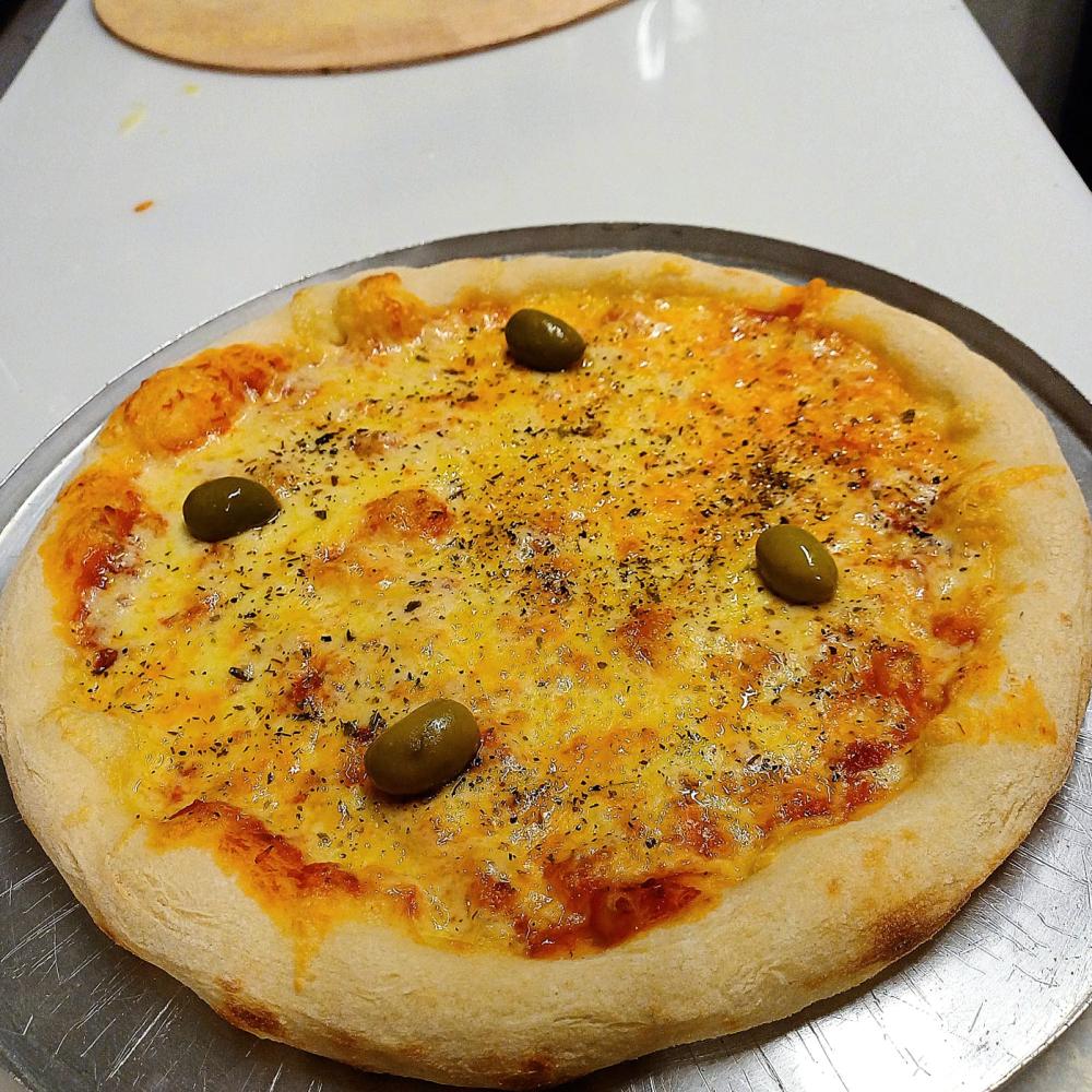 Massa de longa fermentação, molho pomodoro, muçarela, orégano e azeitonas.
