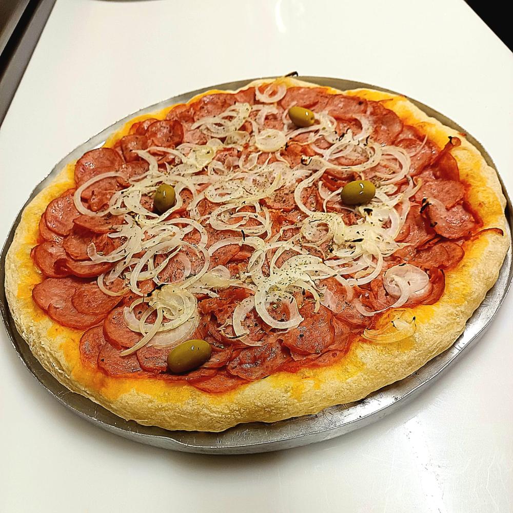Massa de longa fermentação, molho pomodoro, linguiça calabresa, cebola, orégano e azeitonas.